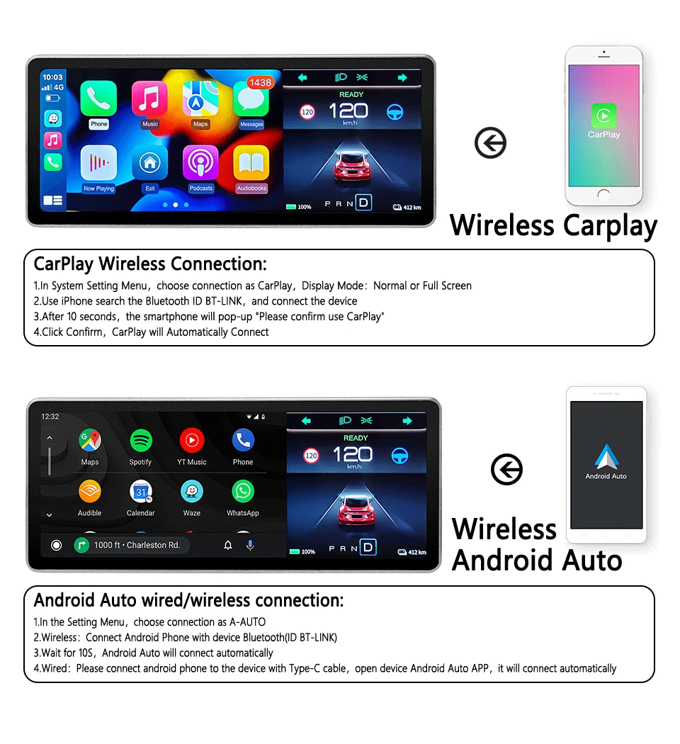 • Supports Apple wireless CarPlay and wired/wireless Android Auto
